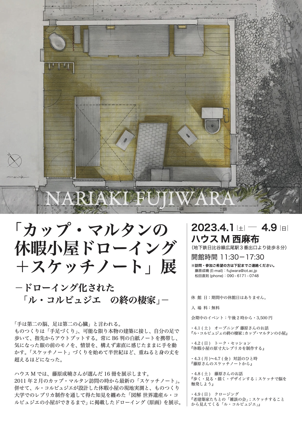 2023年4月、『図解 世界遺産 ル・コルビュジエの小屋ができるまで/カップ・マルタンの休暇小屋、現地実測図面集 』(発行: 株式会社エクスナレッジ)を上梓いたしました。 本書は世界遺産にも指定されているカップ・マルタンの休暇小屋を、ものつくり大学の学生とともに敢行した、フランスで の実測調査から学内での建設過程と更に完成後の空間体験で得た知見をまとめたものです。その中に掲載したドローイング の原画と現地実測時のフィールドノートを展示しました。