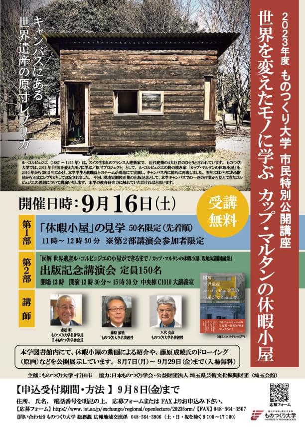 本年3月に上梓致しました「図解世界遺産ル・コルビュジエの小屋ができるまで」の出版記念公開講座を、ものつくり大学にて行います。尚、同図書館では、現在、本書に掲載したドローイング13点に5点を加えた計18点の原画を中心に動画や模型なども展示しています[9/29(金)迄]。