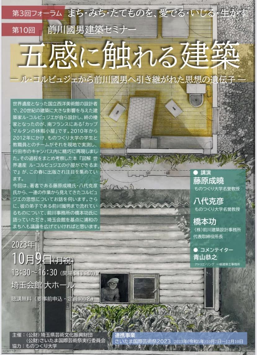 前川國男建築セミナーで「五感に触れる建築」をテーマに埼玉会館にて講演を行います。ル・コルビュジエから前川國男へ引き継がれた思想の遺伝子とは?という、私には身の程知らずのテーマですが、皆様と一緒に考える時間を持ちたいと思います。